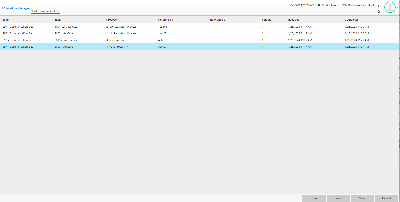 Case: System Reference, Reference 1 – 8, Process Id, Process Description, Task Id, Task Description, Received Date and time, Target Date and time