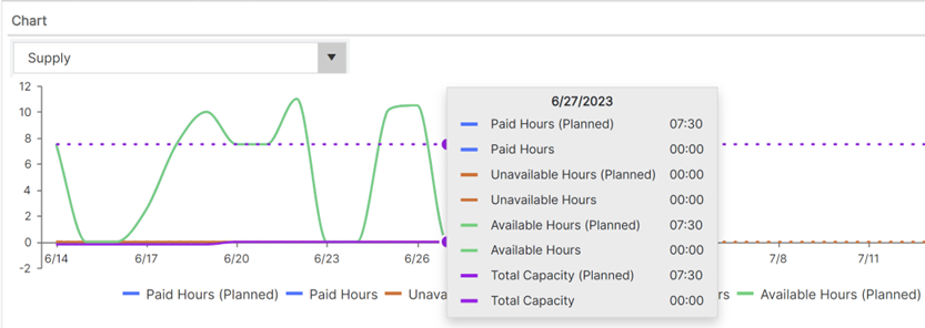 A new chart has been added to the allocation tree to provide a visualization of the availability of an individual to be allocated work for a team. It displays the Available Hours remaining vs Earned Hours Allocated for that date.