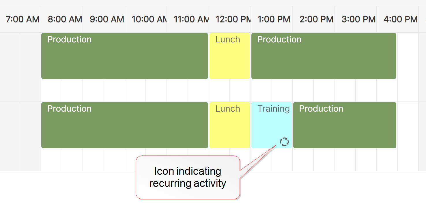 On Planned Attendance, all recurring activities are identified by an icon and the source added in the tooltip for the activity.