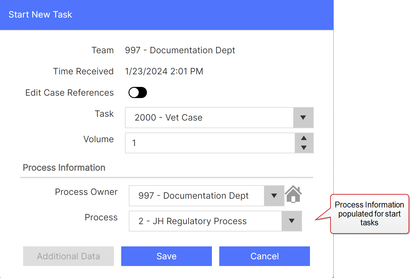 The Start Task functionality has been enhanced to allow you to start a new task quickly with the correct process and case reference information. If the task is a Start Task, when you start it, the case information is already populated. If the task has no case reference information associated with it, the new Start Task dialog is available for you to add it, including specifying the Process to start running.