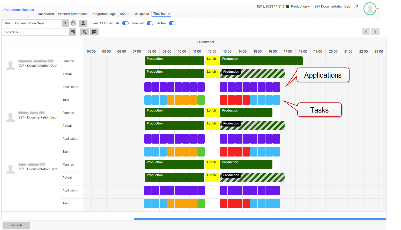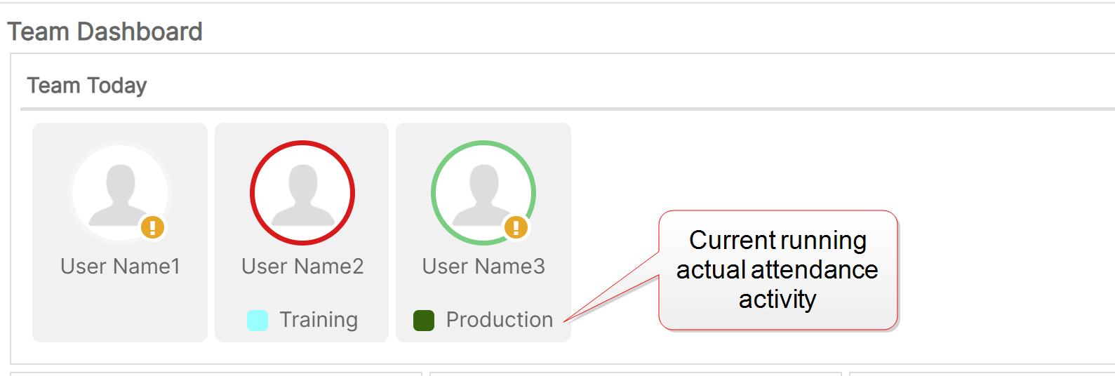On the Team Today widget of the Team Dashboard, the current running actual attendance activity for all individuals in the team is displayed. Team Leaders need to view this info for all individuals in the team at once.