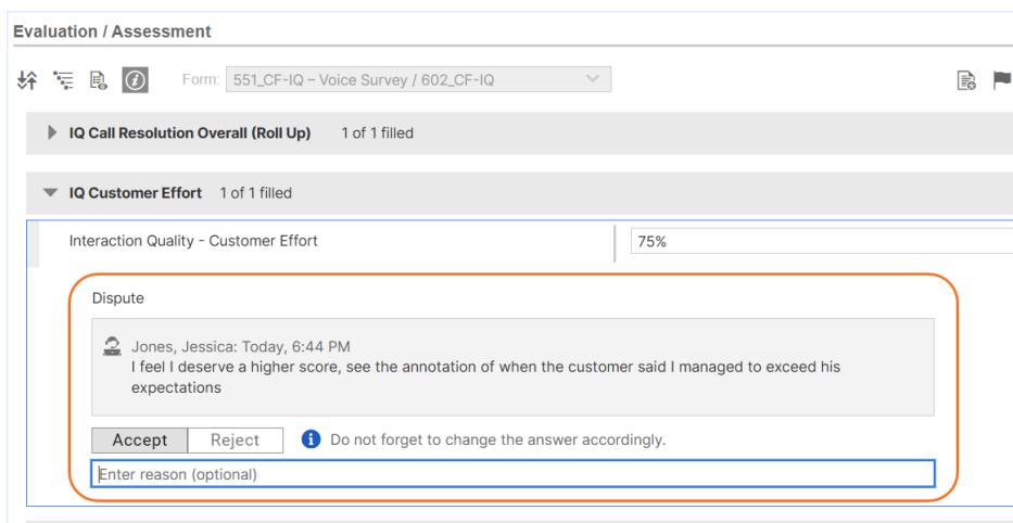 When a dispute is submitted, the evaluation is sent to a designated resolver who reviews each disputed answer. The resolver can either accept the dispute, updating the answer accordingly, or reject the dispute, leaving the original answer unchanged. After all disputed answers are resolved, the evaluation is submitted again, and the score is automatically recalculated if applicable.