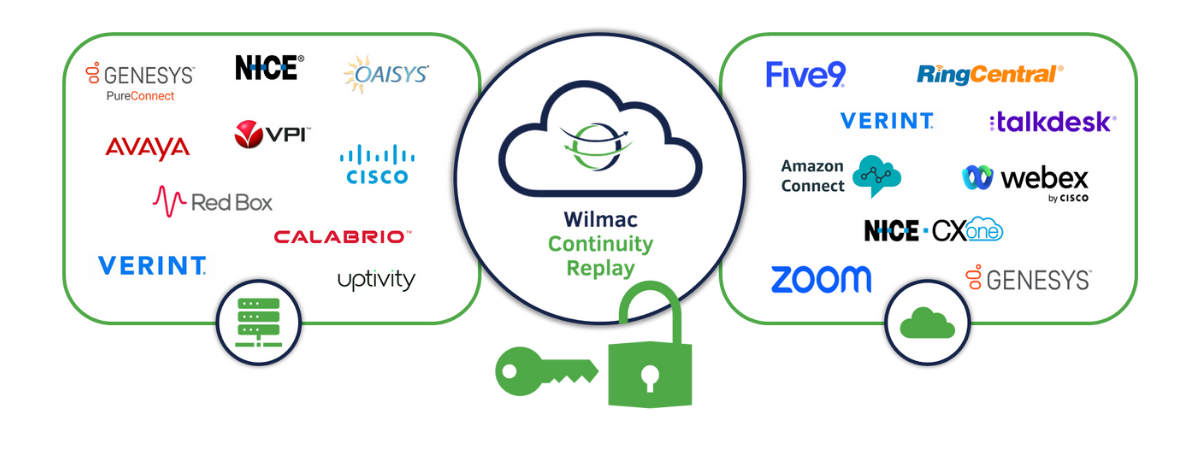 Wilmac Continuity Replay connects to both legacy and modern recording platforms to capture and centralize customer interaction data. Once configured, it ingests and normalizes voice, chat, SMS, video, and screen recordings from over 30 formats, including NICE, Calabrio, Red Box, and CCaaS platforms like Five9, NICE CXone, Genesys, Amazon Connect, and Zoom. The solution provides a secure, web-based interface for unified search, replay, and retention management, ensuring uninterrupted compliance and visibility across historical and real-time interactions.